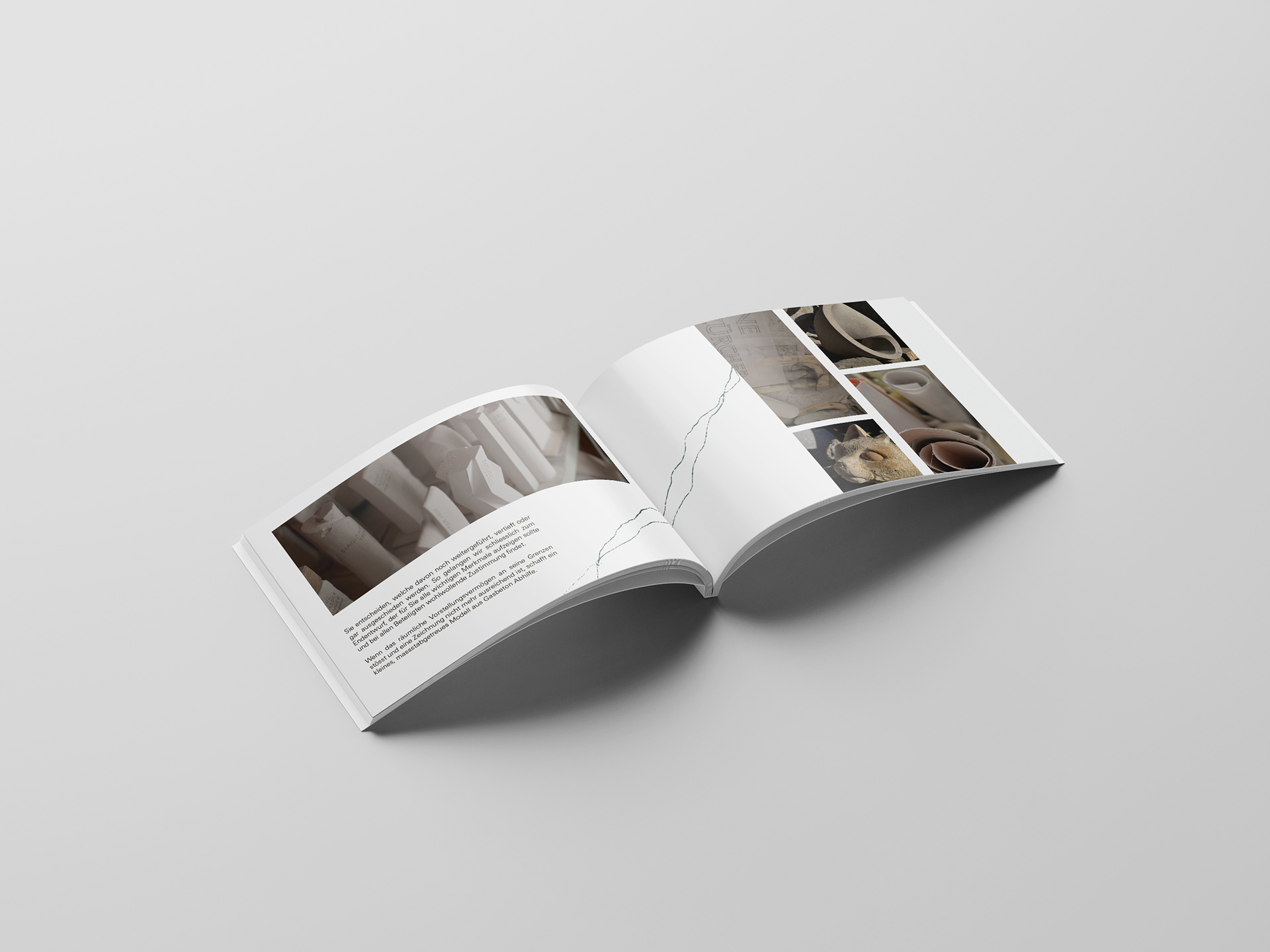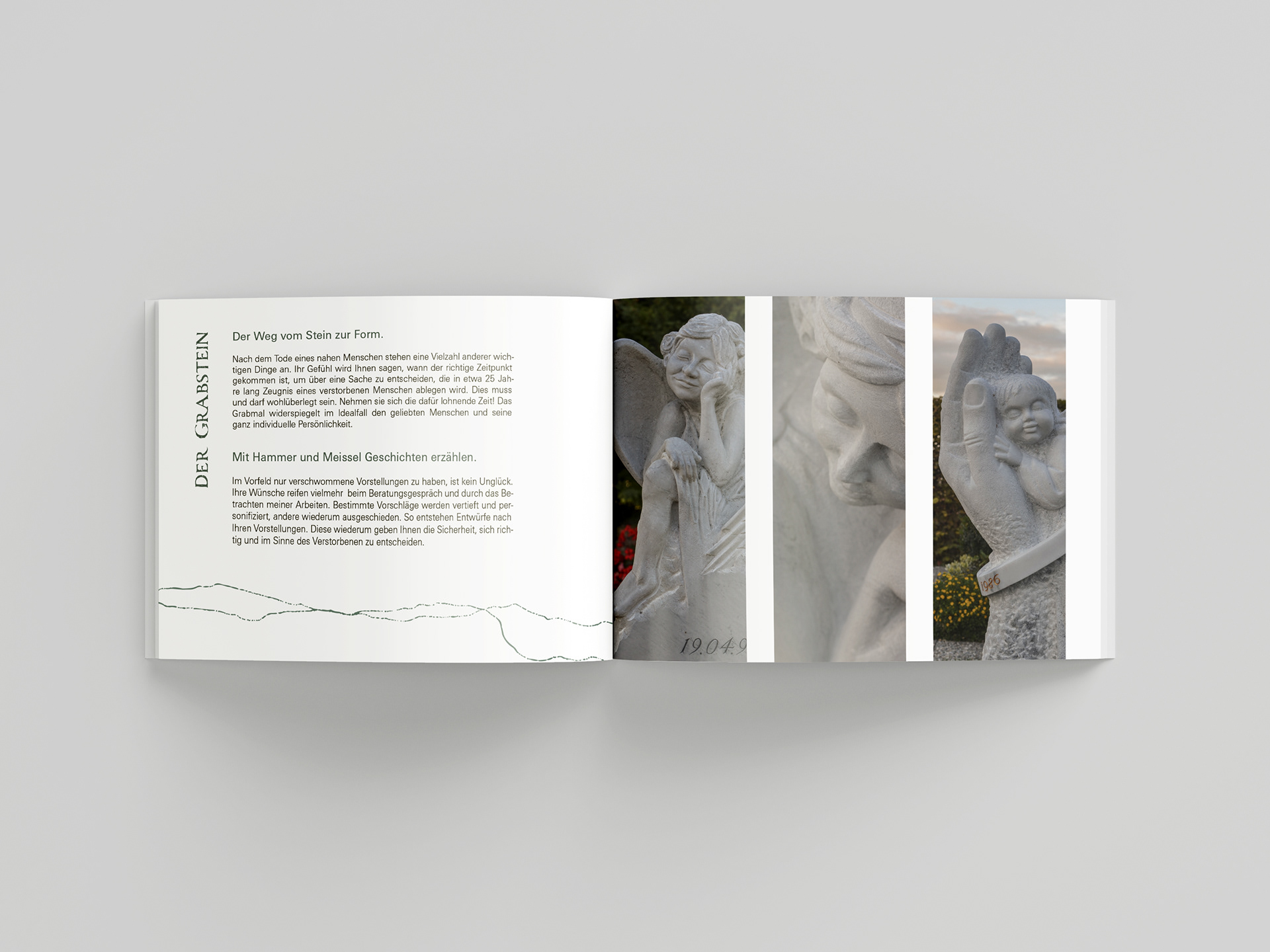 Das Gestaltungskonzept basiert auf Zurückhaltung, Klarheit und Materialbezug. Eine ruhige Serifenschrift bildet die Basis und verleiht dem Auftritt eine wertige, beständige Wirkung. Ein feines, organisches Linienelement – inspiriert von natürlichen Steinrissen – zieht sich als wiederkehrendes Element durch das gesamte Layout und schafft eine visuelle Verbindung zwischen den Inhalten. Die Farbwelt besteht aus gedeckten, natürlichen Tönen, ergänzt durch ein sanftes Salbeigrün als Akzent. In Kombination mit grosszügigem Weissraum entsteht ein ruhiges Gesamtbild, das die Arbeiten des Steinbildhauers in den Mittelpunkt stellt.